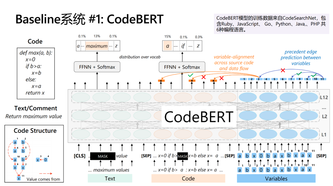 基于 CodeBERT 预训练模型的系统:在自然语言处理领域,BERT 在诸多自然语言理解任务中都展现了非常出色的性能。BERT 的基本思想是把模型的学习过程分为预训练(Pre-training)和微调(Fine-tuning)两个步骤。在预训练阶段,BERT 会从海量无标注的文本中通过自监督优化目标,如语言模型和掩码语言模型,学习通用的词汇上下文语义表示;在微调阶段,已经训练好的模型参数会在下游任务的标注数据上进行微调。受 BERT 的启发,研究员们为参赛者提供了 CodeBERT 模型,即面向编程语言的预训练模型。