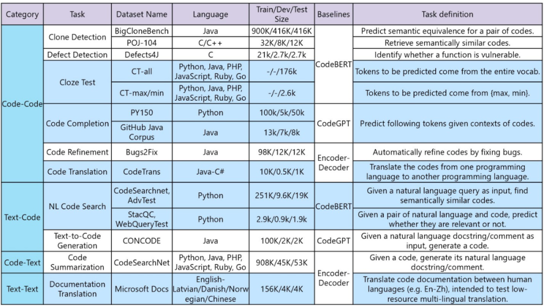 具体来说,CodeXGLUE 中包含如下十项任务: