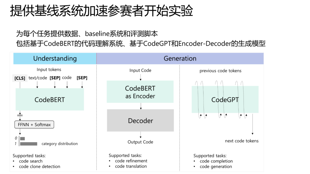 为了让参赛者更容易参与到 CodeXGLUE 中,研究人员为每个任务搭建了目前较为流行的、基于神经网络的基线系统(Baseline)。这些基线系统可以被归为三类:第一类是基于 CodeBERT 预训练模型的系统,能够支持如分类、检索等代码理解任务;第二类是基于 CodeGPT 预训练模型的系统,能够支持代码补全和代码生成任务;第三类是编码器-解码器模型(Encoder-Decoder),能够更好地支撑如代码翻译、代码纠错等生成任务。下图给出了三类基线系统的总况,接下来将分别对每个基线系统进行介绍。