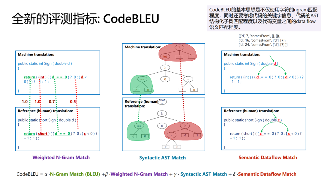 评测指标的选取至关重要,它定义了区分模型优劣的标准。目前,业界大多使用 BLEU 评价生成代码的质量,其基本思想是计算生成代码和标准答案代码 ngram 的匹配程度。然而,代码蕴含着丰富的语法和语义结构,BLEU 无法捕捉代码的结构特性。因此,微软亚洲研究院的研究员们提出了 CodeBLEU 来更好地评价自动生成代码的质量。CodeBLEU 的基本思想是不仅使用字符的 ngram 匹配程度,还要同时考虑代码的关键字信息、AST 结构化子树信息以及代码变量之间的数据流信息。CodeBLEU 的最终结果由各个子部分加权求和获得。