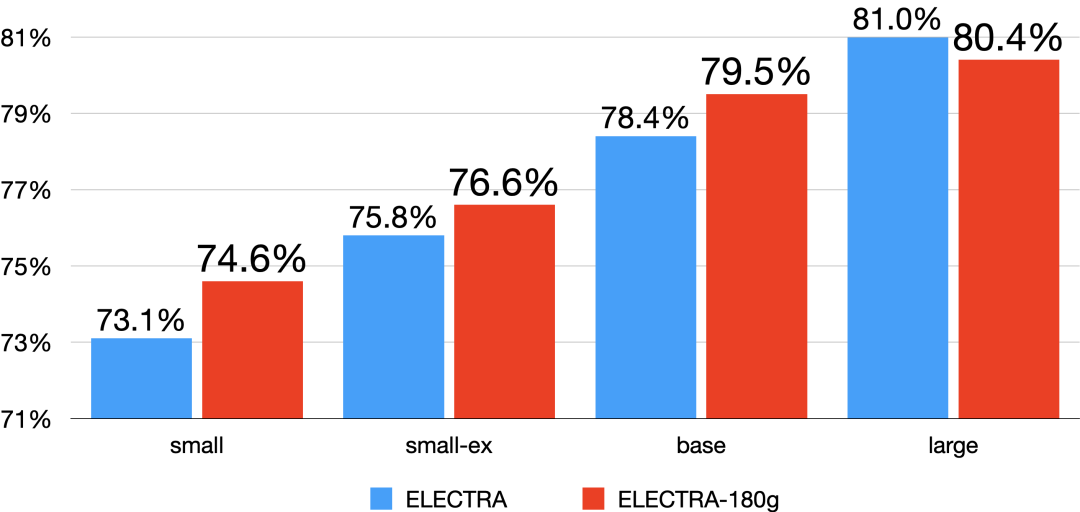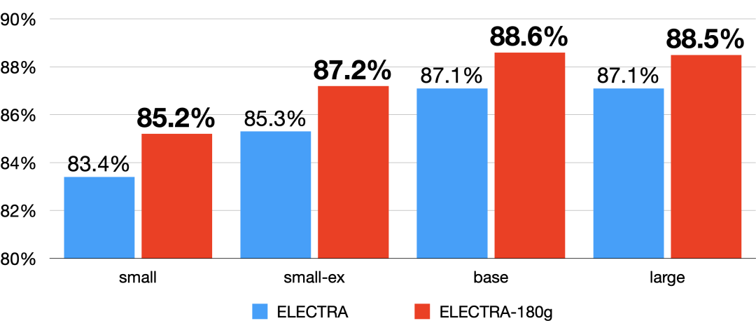 在CMRC 2018(简体中文阅读理解),DRCD(繁体中文阅读理解),XNLI(自然语言推断),BQ Corpus(句对分类)任务上,ELECTRA-180G显著超过原版ELECTRA的效果。更详细的效果评测请查看项目的GitHub。