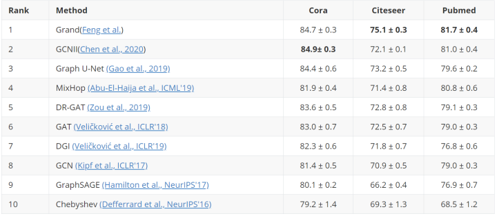 “ 对图领域中每种任务,我们提供了一套完整的“数据处理-模型搭建-模型训练-模型评估”的方案,易于研发人员做相关的实验。比如对于图上半监督节点分类任务,我们整合了常用的数据集 Cora、Citeseer、Pubmed,提供了经典的/前沿的各种模型(包括GCN、GAT、GCNII 等),提供了相应的训练脚本,并且整理出了一个相应的排行榜作为参考。” CogDL 开发者说。