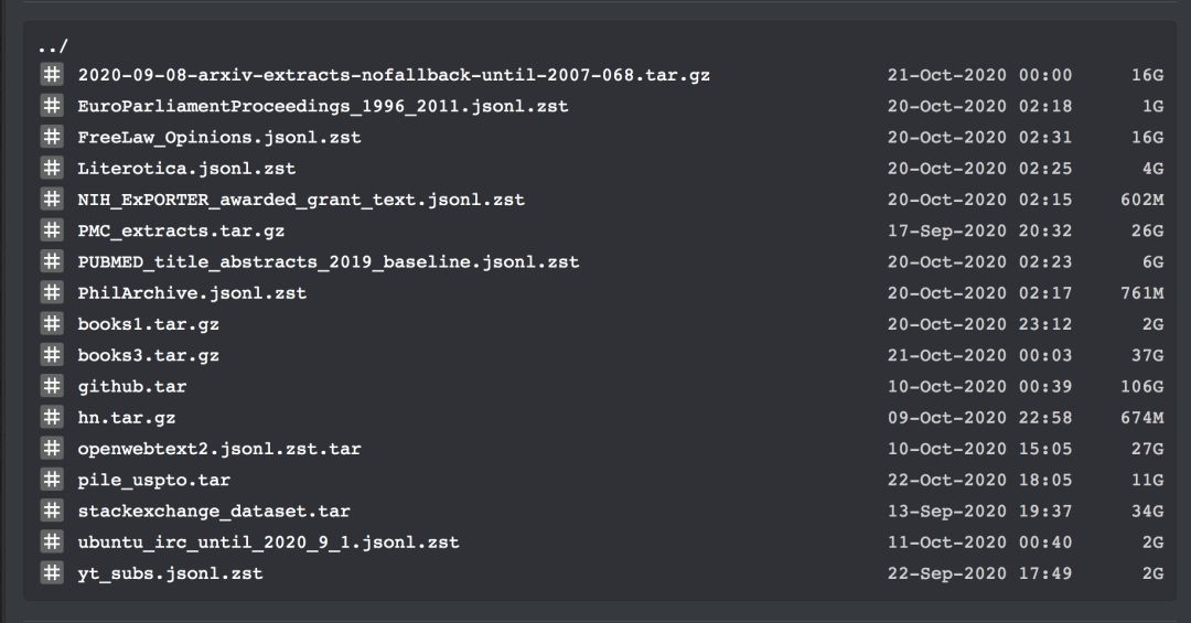 该数据集涵盖了截至 2020 年 9 月所有大型文本语料库的下载链接。除此之外,它还包含了所有的 bibliotik(一个线上图书资源库)中书籍的纯文本,以及大量用于训练的代码。