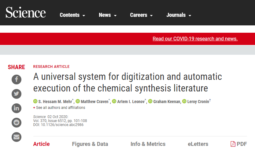 相关工作以 “ A universal system for digitization and automatic execution of the chemical synthesis literature” 为题,在线发表在顶级科学期刊《科学》( Science)上。