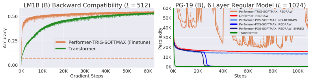 图 | 将原始的经过预训练的 Transformer 的 权重 转移到 Performer 中,Performer 产的精度达到 0.07 (橙色虚线),但在原来的梯度步数的一小部分中,很快就恢复了精度。