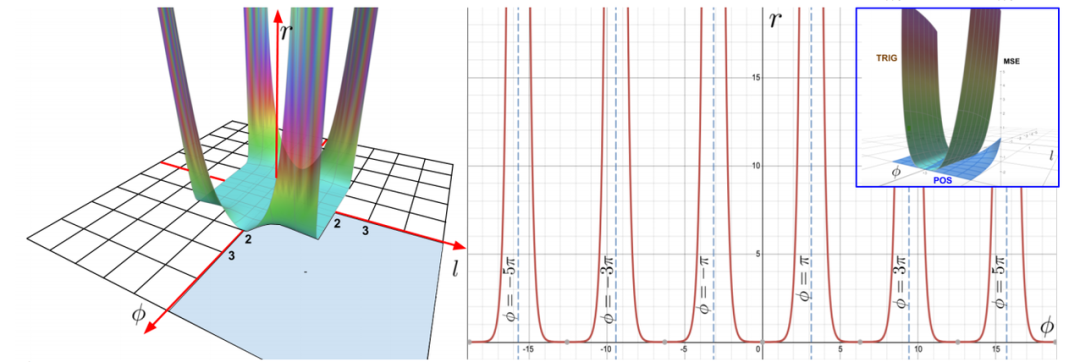 图 | 原点对称的通用函数 r(定义为建立在:三角随机特征和正随机特征上的估计器的均方误差(MSEs)的比值)是输入特征向量与其长度l之间的角度 φ(以弧度为单位)的函数, 函数的数值越大表示正随机特征性能越好的(φ,l)空间区域(左);当 l 为定值 1 时,与变化的角度 φ 构成的函数 r 为正切函数,以及比较低 softmax 内核值区域中两个估算器的 MSE(右)。