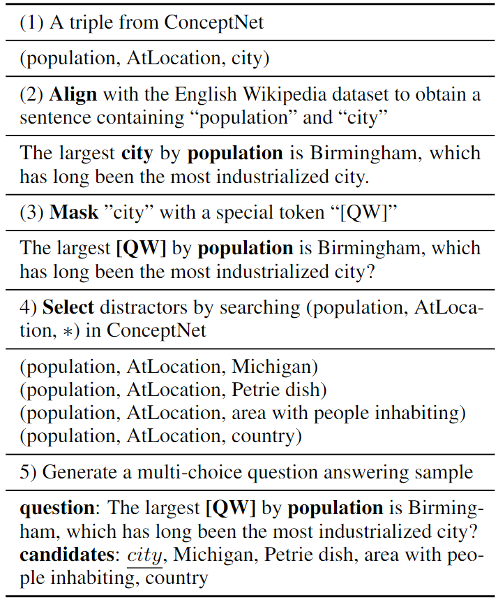 - 基于三元组中的mask之外的词去ConceptNet搜索,找4个包含这两个词的三元组作为干扰。如果大于4个,随机选4个,反之过滤掉;(select)