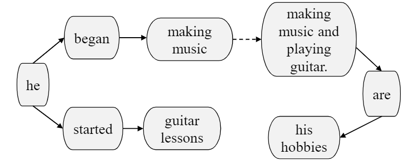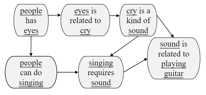 Lv等人 [14]提出了一个融合异构知识源的基于 图 神经网络 的常识问答模型。作者从结构化知识基础(即ConceptNet)和Wikipedia纯文本中提取证据,并为这两个来源构造图以获取证据的关系结构,如图9和图10所示。