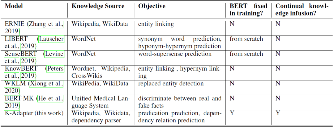 这里对比一下最近提出的一系列将知识融入预训练模型的方法,如表2所示: