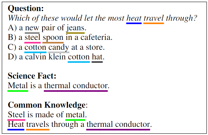 OpenBookQA [5]数据集解决了先前QA数据集的一些缺点,较早的数据集通常不需要外部知识或推理即可解决,而确实需要外部知识的领域又很难捕获。OpenBookQA包含大约6,000个多项选择的问题,需要结合科学事实或常识知识来回答,如图5中的示例。OpenBookQA提供了约1300个科学事实的“open book”,每个事实都与问题直接相关,作者希望可以使用外部资源来支持回答问题。