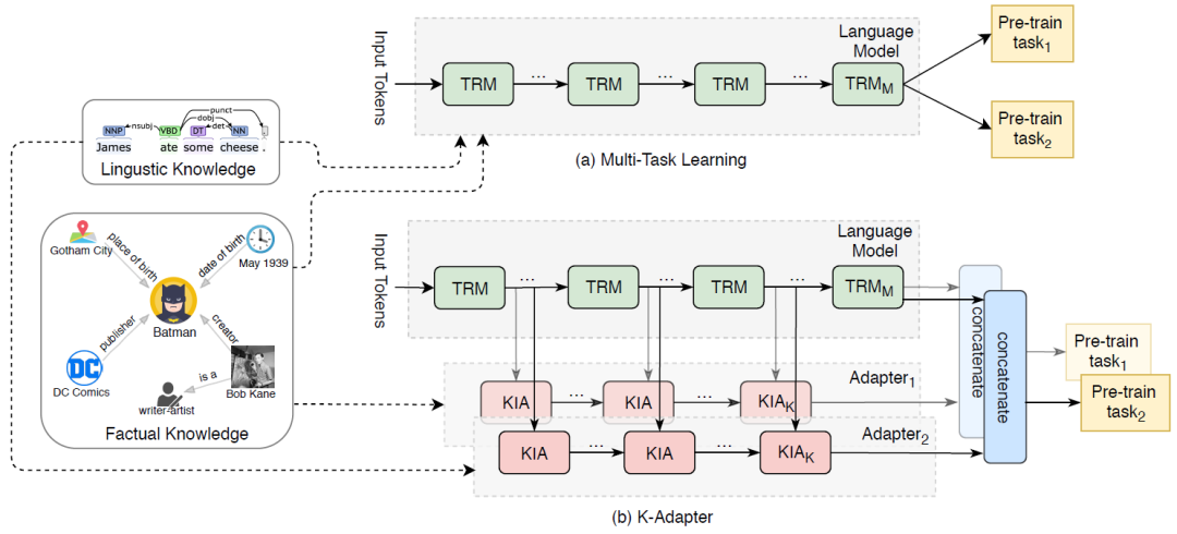 Wang等人 [11]研究了将知识注入诸如BERT和RoBERTa之类的大型预训练模型中的问题。现有方法通常会在注入知识时更新预训练模型的原始 参数 。但是当注入多种知识时,它们可能会遭受灾难性的遗忘。为了解决这个问题,作者提出了K-ADAPTER,它保持了固定的预训练模型的原始 参数 ,并支持持续的知识注入。以RoBERTa为预训练模型,K-ADAPTER具有用于每种注入知识的神经适配器(adapter),就像是连接到RoBERTa的插件,如图6所示。