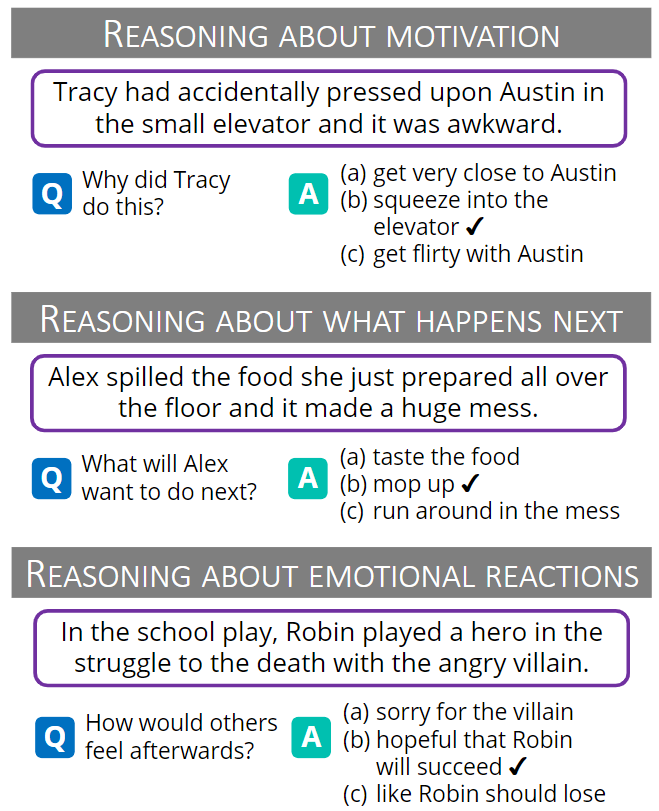 Social IQA [4]是第一个面向社交情况 常识推理 的大规模 基准 ,包含38000个覆盖日常情形中社交情感和智慧的多选问题,涵盖了关于在情境中描述人们的行为的各种类型的推断,对于基于预训练 语言模型 的现有问答模型具有挑战性。值得注意的是,SOCIAL IQA也可以作为常识知识 迁移学习 的资源,在多个 常识推理 任务(Winograd Schemas,COPA)上达到了最好的结果。数据集示例如图4所示。