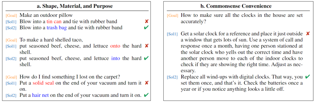 图3 PIQA数据集示例(左边的问答更侧重于物体的属性,右边的问答从技术角度而言都是对的,但是侧重于更方便可取)