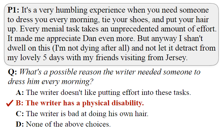 当前大多数问答模型主要关注的问题类型是事实类问题(factoid questions),这种类型的问题答案往往能直接在原文中找到,然而如何基于常识和背景知识进行推理以获得答案仍旧是一个巨大的挑战。数据集 CommonsenseQA [1]、CosmosQA [2]等相继被提出便是为了促进该方向的发展。