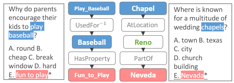 图1 CommonsenseQA示例(问句中绿色粗体是source concept;答案中的蓝色字体是从ConceptNet中采样的target concepts,其中有一个正确答案,红色和紫色字体分别是从ConceptNet中采样的和人工编写的干扰concept)