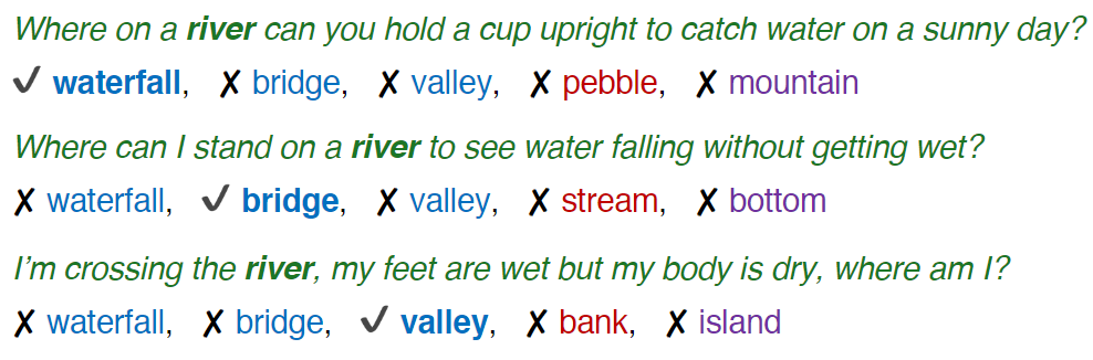 PIQA [3]专注于日常生活中的物理常识,偏爱非典型的解决方案。图3展示了PIQA的示例。PIQA 数据集由 16,000 多个训练的QA对组成,另外分别提供了约2K和3K进行开发和测试。目的长度平均为7.8个单词,正确和不正确的解决方案平均长度为21.3个单词,正确和不正确解决方案所使用的单词之间至少有85%的重叠。通过对名词、动词、形容词、副词出现的词频统计,验证了数据集确实是和物理现象强相关的。比如,出现词频最高的形容词中包括状态(干燥的、干净的、烫的)、形状(小的、锋利的、平坦的)、形式(快速的、仔细的),这些属性通常决定了解决方案的正确与否。