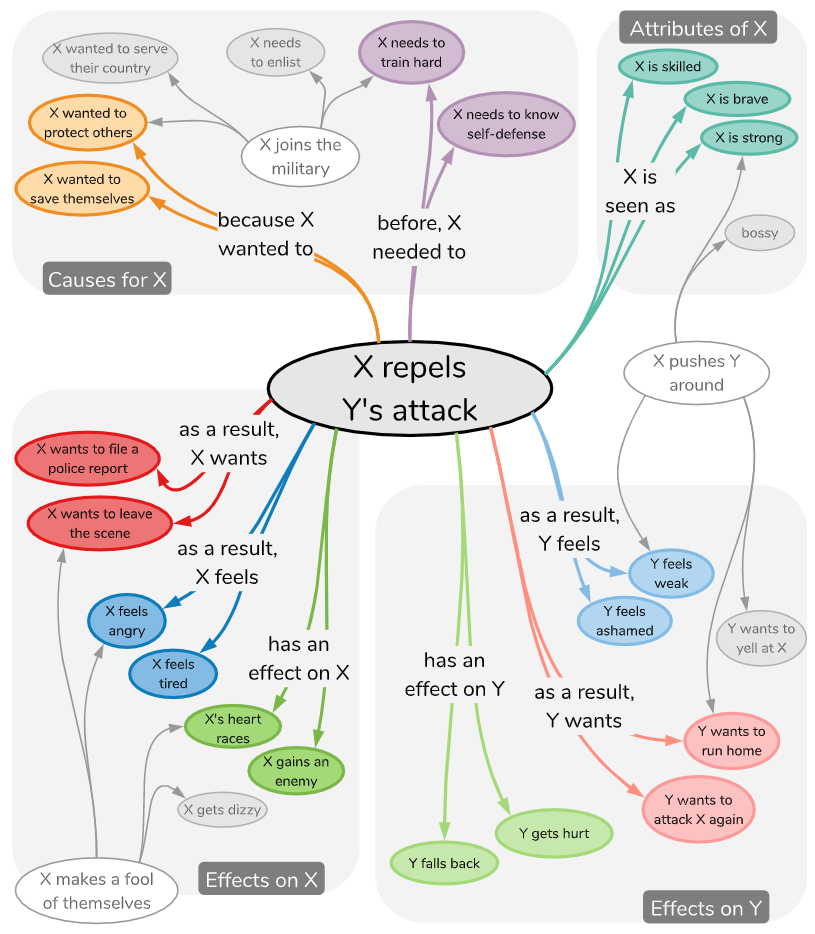 ATOMIC [7]是一个包含87万条推理常识的 知识图谱 ,包含870k条推理常识,相较于常见的基于本体论分类条目的 知识图谱 ,该 知识库 专注于“if...then...”关系的知识。作者提出了9种类型的因果联系来区分原因-效果、主体-主题、自愿-非自愿、行动-心理状态。例如:事件“x防御了y的攻击”,我们能够马上推理出 x的动机是“保护自己”、 x这么做的先决条件是接受了一定的防身技巧、 x可能的特点是强壮勇敢。事件的结果可能是:x会感觉生气并报警、 y可能会觉得害怕并想要逃走。通过生成式训练,作者发现 神经网络 模型可以从该图谱中获取简单的 常识推理 能力。