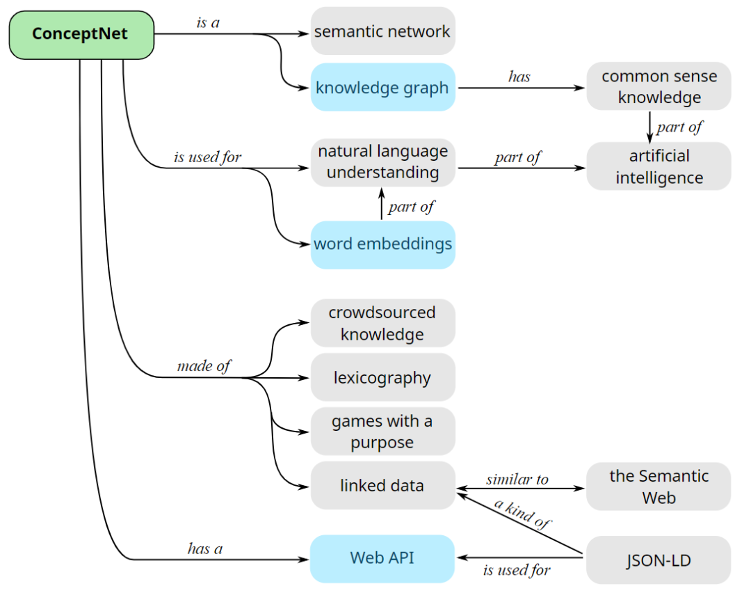 ConceptNet [6]是一个已成功应用于NLI系统中的常识 知识库 。最早源于MIT媒体实验室的Open Mind Common Sense(OMCS)项目,OMCS项目是由著名AI专家Marvin Minsky于1999年创立,该项目从在线用户那里收集了free text的常识知识。这个 语义网 络最初包含超过160万条常识知识,这些知识表示为300,000个实体节点之间的链接,但是后续版本对其进行了扩展并添加了更多功能。最新版本的ConceptNet 5.5包含800万个节点之间的2100万个链接,并增加了Cyc, WordNet 和DBpedia等其他资源,它包括来自多语言资源的知识,以及来自其他 知识图谱 的知识的链接。与Cyc相比,ConceptNet采用了非形式化、更加接近自然语言的描述;与链接数据和谷歌 知识图谱 相比,ConceptNet比较侧重于词与词之间的关系。与 WordNet 相比,包含的关系类型多。ConceptNet完全免费开放,并支持多种语言。