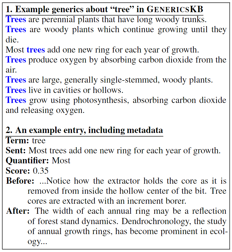 GenericsKB [8]是AI2提出的包含340万个通用句子的大型非结构化 知识库 ,通用句子是指表达一般事实的语句,例如“Dogs bark”和“Trees remove carbon dioxide from the atmosphere”。这是第一个包含天然存在的通用句子的大型资源库,而不是抽取或众包的三元组,因此富含高质量、一般性、语义完整的陈述。GenericsKB主要从三个大型文本源中提取:Waterloo 语料库 、Simple Wikipedia和ARC 语料库 。其中的所有句子均带有主题词,上下文句子和学习到的置信度评分。GenericsKB-Best中还提供了一个经过过滤的高质量子集,其中包含1,020,868个句子。