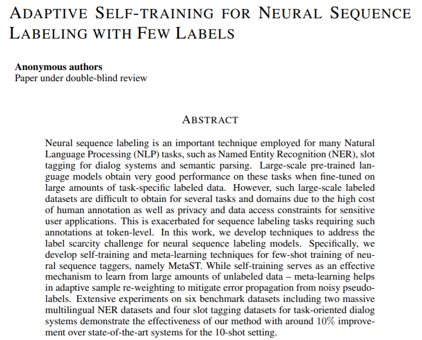 论文标题:Adaptive Self-training for Neural Sequence Labeling with Few Labels