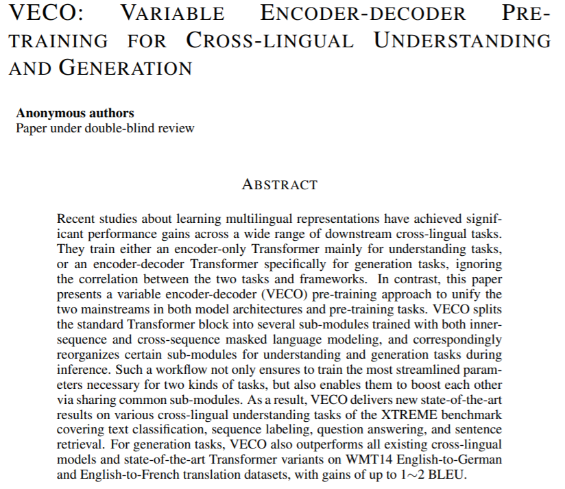 论文标题:VECO: Variable Encoder-Decoder Pretraining for Cross-Lingual Understanding and Generation