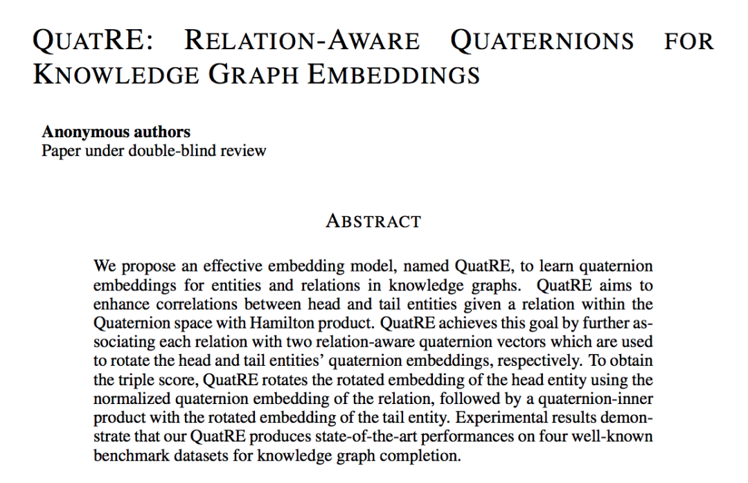 论文标题:QuatRE: Relation-Aware Quaternions for Knowledge Graph Embeddings