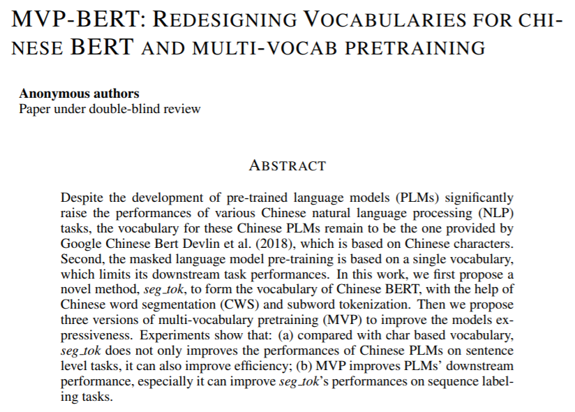 论文标题:MVP-BERT: Redesigning Vocabularies for Chinese BERT and Multi-Vocab Pretraining