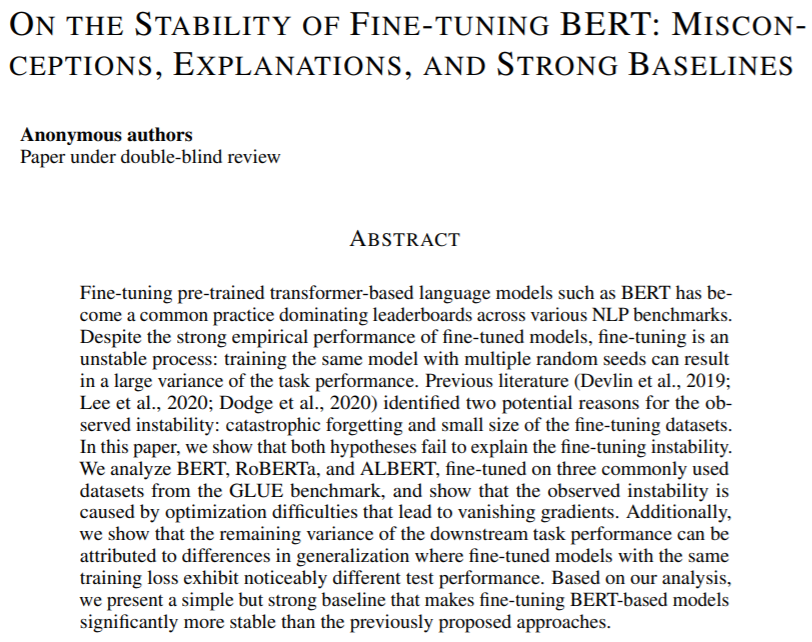 论文标题:On the Stability of Fine-tuning BERT: Misconceptions, Explanations, and Strong Baselines