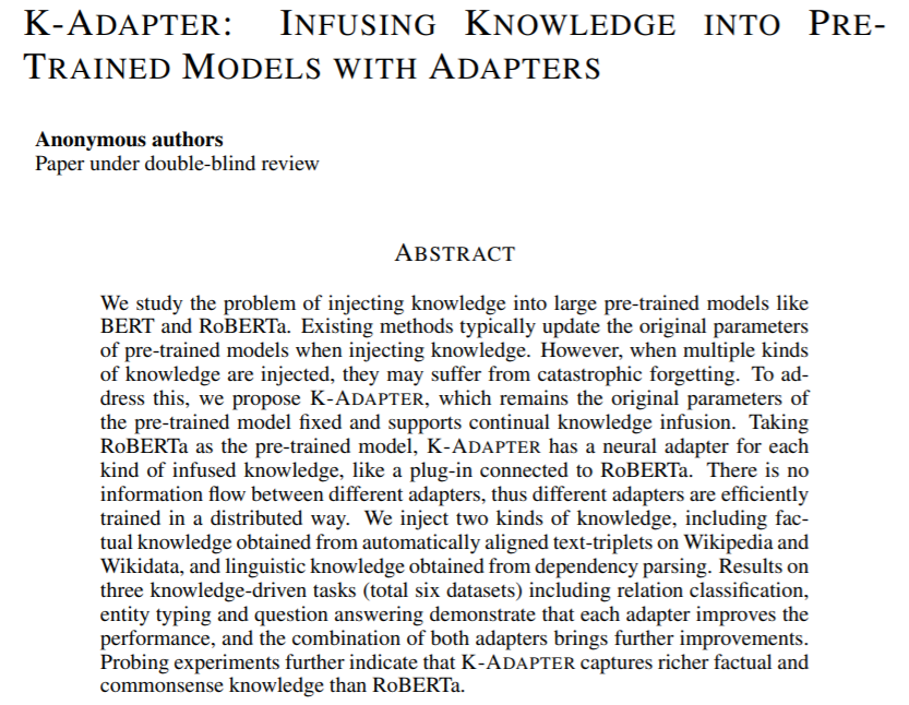 论文标题:K-Adapter: Infusing Knowledge into Pre-Trained Models with Adapters