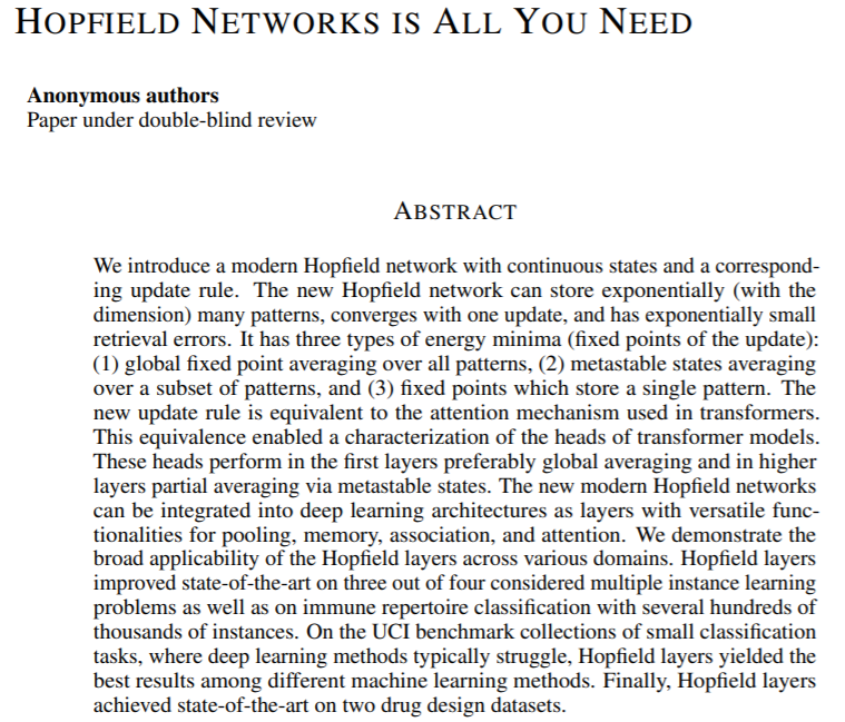 论文摘要:我们介绍了具有连续状态和相应更新规则的现代 Hopfield网络 。新的 Hopfield网络 可以按指数形式(按维度)存储许多模式,一次更新即可 收敛 ,并且检索误差呈指数形式。