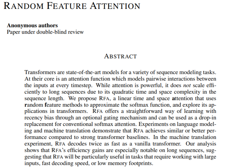 论文摘要:我们提出了一种基于随机特征的注意力,该注意力在序列长度上线性扩展,并且在语言建模和 机器翻译 方面与强大的Transformer基线相当。