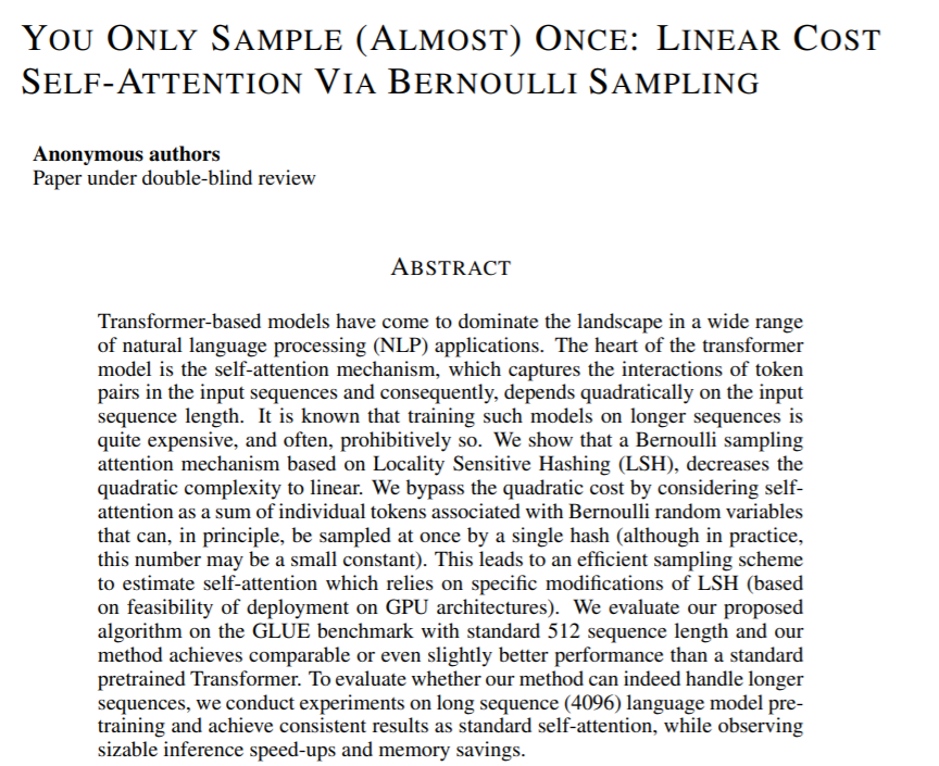论文标题:You Only Sample (Almost) Once: Linear Cost Self-Attention Via Bernoulli Sampling