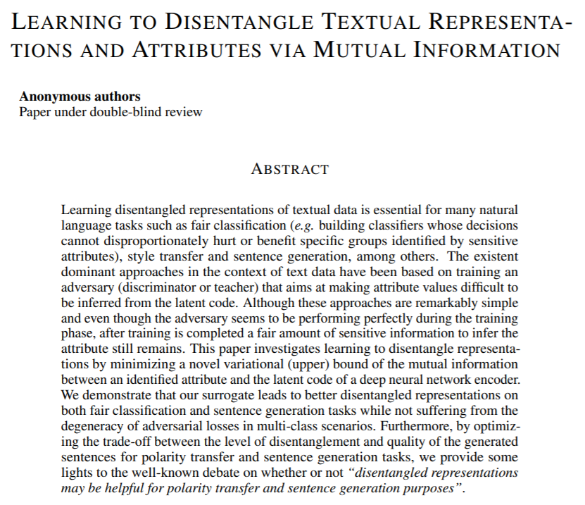 论文标题:Learning to Disentangle Textual Representations and Attributes via Mutual Information