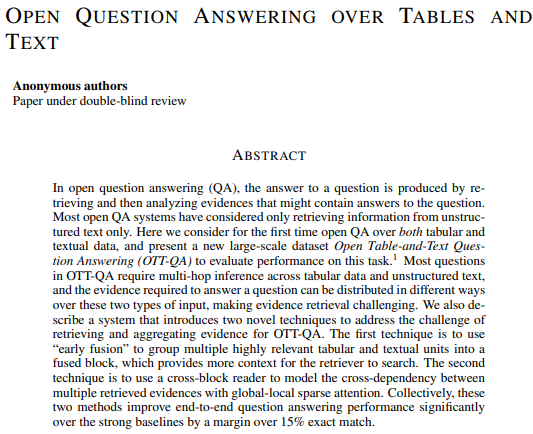 论文摘要:我们提出了通过网络表格和文本回答开放域问题的新任务,并设计了新技术:1)融合检索2)跨块阅读器,以解决新任务带来的挑战。