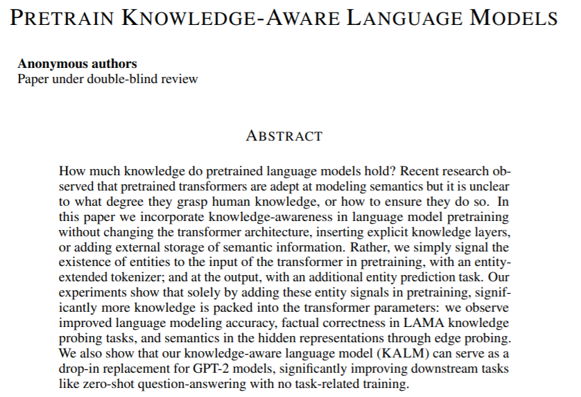 论文摘要:在本文中,我们将知识意识纳入 语言模型 预训练中,而无需更改Transformer架构,插入明确的知识层或添加语义信息的外部存储。相反,我们只是通过实体扩展的标记器在预训练中向Transformer的输入简单地表示实体的存在。在输出处,还有一个额外的实体预测任务。