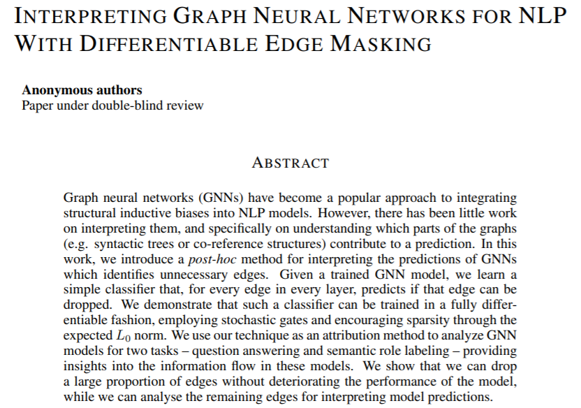 论文标题:Interpreting Graph Neural Networks for NLP With Differentiable Edge Masking