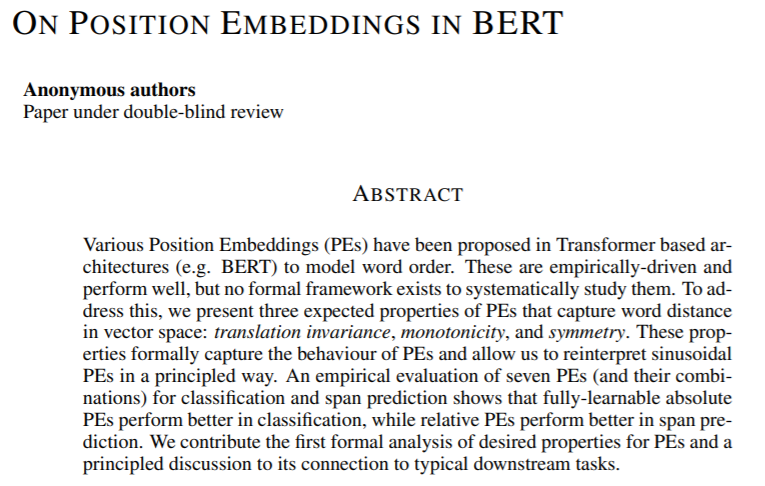 论文摘要:我们提出了在向量空间中捕获单词距离的PE的三个预期特性:平移不变性,单调性和对称性。这些属性可以正式捕获PE的行为,并允许我们以有原则的方式重新解释正弦PE。对七个PE(及其组合)进行分类和跨度预测的经验评估表明,可完全学习的绝对PE在分类中表现更好,而相对PE在跨度预测中表现更好。