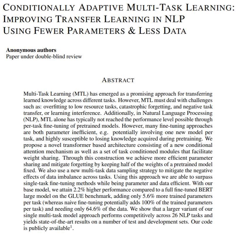 论文标题:Conditionally Adaptive Multi-Task Learning: Improving Transfer Learning in NLP Using Fewer Parameters & Less Data