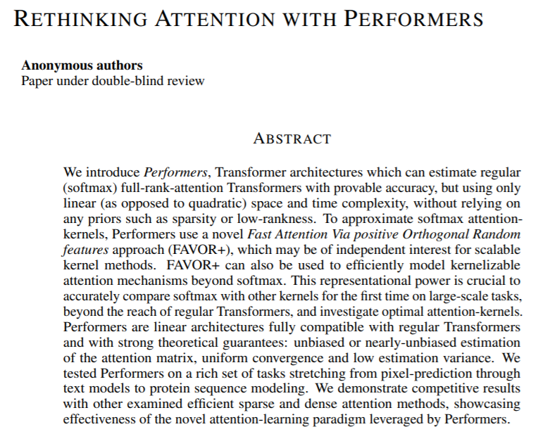 论文摘要:我们介绍了Performer,仅使用线性(而不是二次)空间和 时间复杂度 ,而无需依赖于诸如稀疏性或低等级的先验条件。为了近似softmax注意力内核,Performer使用一种新颖的通过正正交随机特征方法(FAVOR +)实现的快速注意力,它对于可扩展内核方法可能是独立关注的。