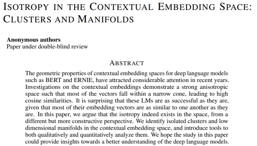 论文标题:Isotropy in the Contextual Embedding Space: Clusters and Manifolds