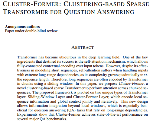 论文标题:Cluster-Former: Clustering-based Sparse Transformer for Question Answering