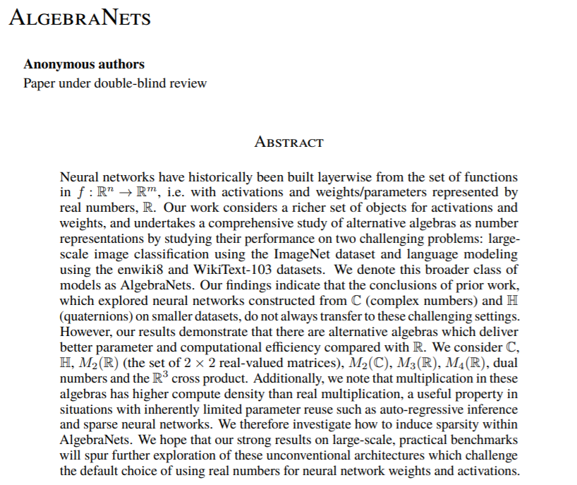 论文摘要:常规的 神经网络 由实值加权和激活以及实值算子组成。我们提出了AlgebraNets,这是一种一般范式,可以用其他方式从其他关联代数中替换 权重 和运算符来代替实际价值 权重 和运算符。