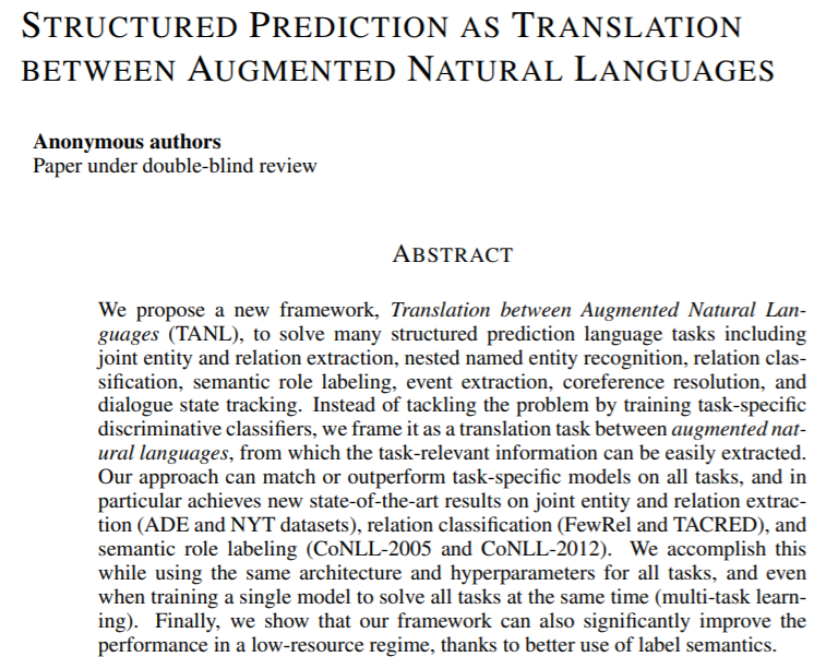 论文摘要:我们提出了一个新的框架,即增强自然语言之间的翻译(TANL),以解决许多结构化预测语言任务,包括联合实体和 关系提取 , 嵌套 命名实体识别 , 关系分类 ,语义角色标签,事件提取,共指解析和对话状态跟踪。