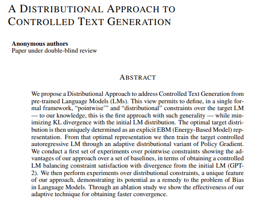 论文摘要:我们提出了一种分布式方法来解决从预训练的 语言模型 (LM)生成受控文本的问题。这种观点允许在单个正式框架中定义目标LM的“逐点”约束和“分布”约束,同时将初始LM的KL差异最小化分配。然后,将最佳目标分布唯一确定为明确的EBM(基于能量的模型)表示。从最佳表示中,我们然后通过策略梯度的自适应分布变量训练目标受控自回归LM。