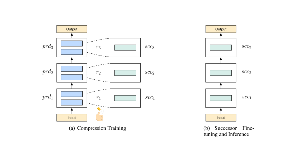 该方法的工作流程如下图所示。首先为每个前辈模块指定一个接替者模块,然后在训练阶段中以一定的概率(如抛硬币)决定是否用替代模块随机替换对应的前辈模块,并按照新旧模块组合的方式继续训练。在模型 收敛 后,将所有接替者模块组合成接替者模型,进而执行推断。这样就可以将大型前辈模型压缩成紧凑的接替者模型了。