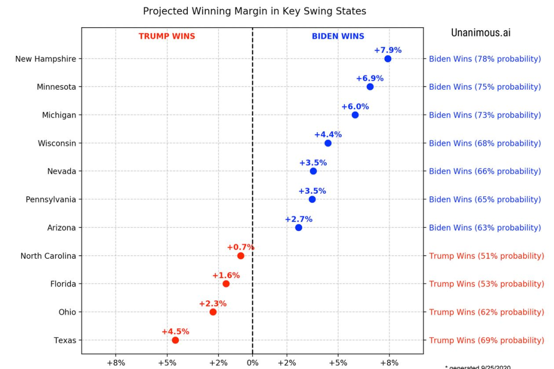 图 | Unanimous.ai 9月进行了一次现场调查,要求50名参与者预测谁将赢得11个战场州的总统竞选,以及以什么优势赢得总统竞选(来源:UNANIMOUS.AI)