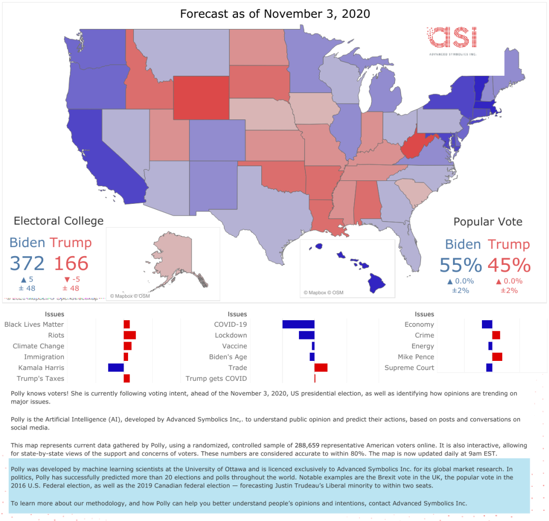 无独有偶,由渥太华大学的科学家开发的"Advanced Symbolics polly"收集了一个随机的,受控的美国选民样本,例如“黑人的命也是命运动”“中国问题”“新冠疫情”等。通过他们的帖子和在社交媒体上的谈话进行识别。基于此预测得出:佛罗里达州将投票给拜登,并占该州总票数的 52.6%。事实后来我们都知道,特朗普在此翻盘,一度让盘面上的局势胶着不下。