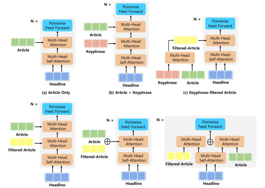 对于关键短语敏感的新闻标题 生成模型 ,基于 BERT 作为编码器,Transformer 作为解码器并带有 copy 机制的新闻标题生成 BASE 模型,研究员们进一步探索了几种在解码器处引入关键短语信息的模型结构,如图2所示。