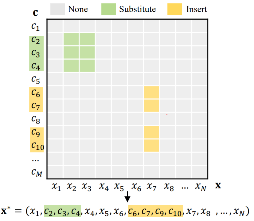 图4:编辑操作可以视为二维平面上词对词的编辑矩阵