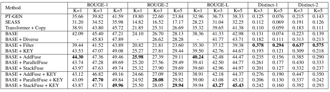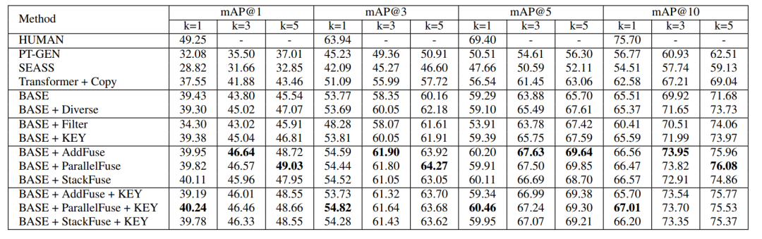 对于新闻文章的关键短语生成,研究员们尝试了 TF-IDF、Seq2seq 和 POS Tagging 等方法。他们通过实验对比了关键短语生成的效果(表1),以及和多种基准方法与模型变体在生成标题的质量和多样性上进行了人工评价和自动评价(表2)。并且通过一个基于检索的实验(表3),将生成的新闻标题作为新闻的搜索键值,通过对应的用户 查询 去检索新闻,来进一步测试生成新闻的质量和多样性。大量的实验结果证明了本文提出方法的有效性。